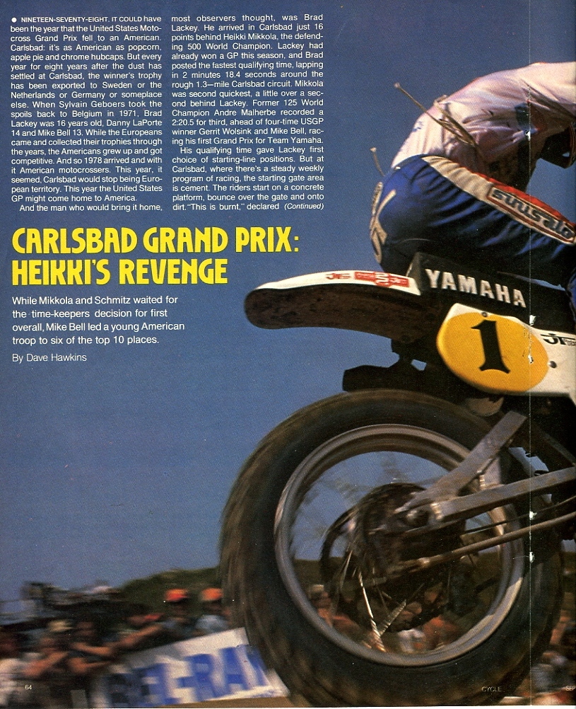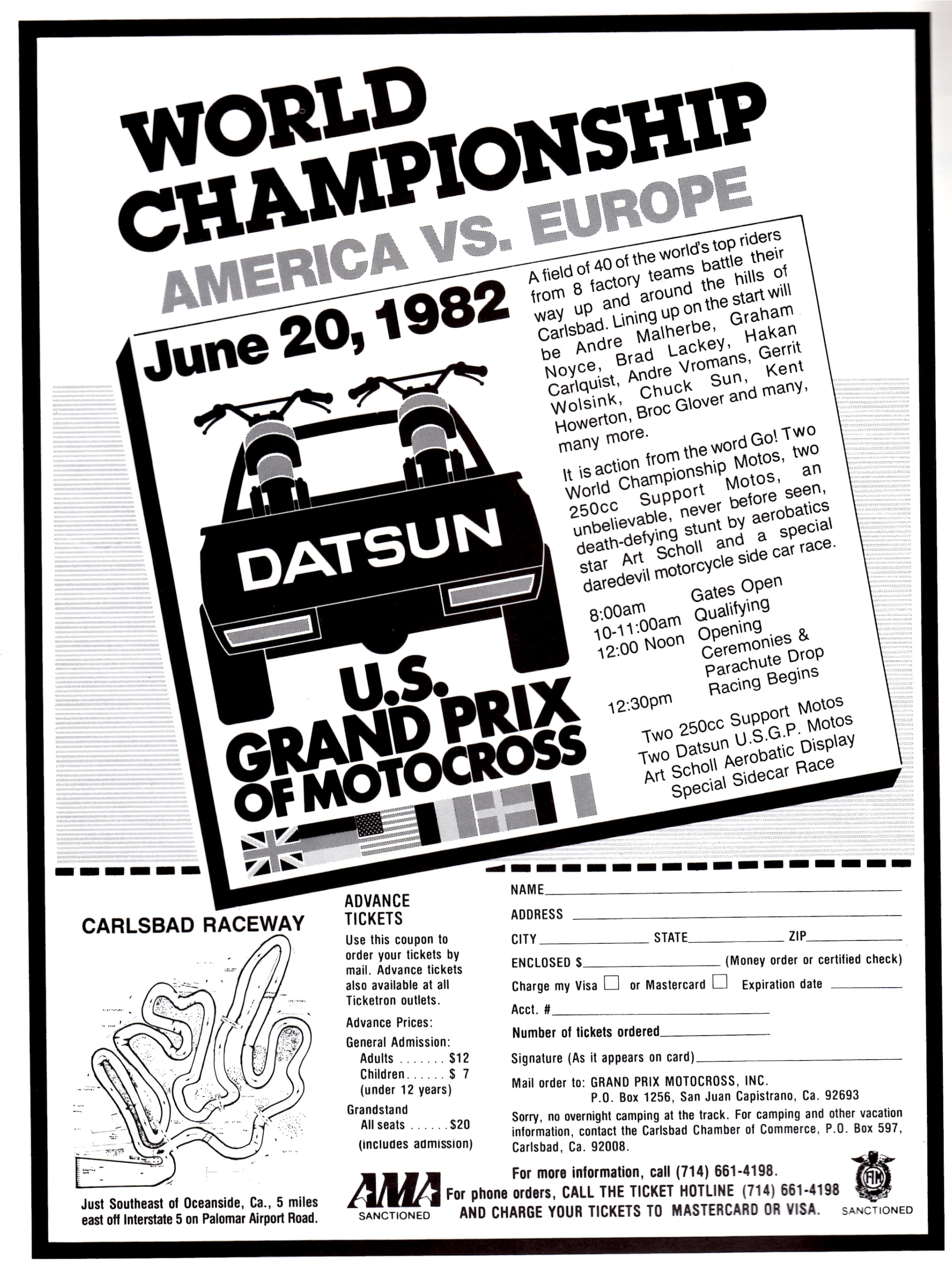 I am from tucson and attended all the usgp races, boy can i remember. The sign off the freeway heading north saying motocross, very cool. Open beachs no mass developement. The euro feel going inland to the track all the farmland. We had a track in arizona same fate, arizonacyclepark huge uphills and downhills, completly lined with snowfence and believe it or not the most rich black no dust loam you could ever ask for, the city of phoenix dumped all there organic matter there it was unreal. I over heard Willie Baurer think thats the correct spelling, any how he was talking to Perrie Karsmakers and stated this was the best soil he had ever ridden on. Any way I only rode carlsbad once. The freeway up hill and long fast downhill what a rush.I don"t know but when the open or 500 class went away as far as I was cocerned motocross died. Now with the beheading of two strokes. Its a real shame. I was able to get the full vip treatment when the Bowmans and Roger Decoster brought the usgp for its short run at glen helen in the early 90s The Bowmans lived in scottsdale and really gave it a try. Now we have notting. I"m not even sure if unadilla gets its 250gp any more. Carlsbad will always be king , I walked down into where the track use to be some years back and after I got chased out I almost cried. I contacted sports illustrated and the gone wide world of sports to try and find out how or if they had usgp cds. Hardly new what I was talking about. I have some footage but would like to upgrade for the future. Thanks -- Bill Peel