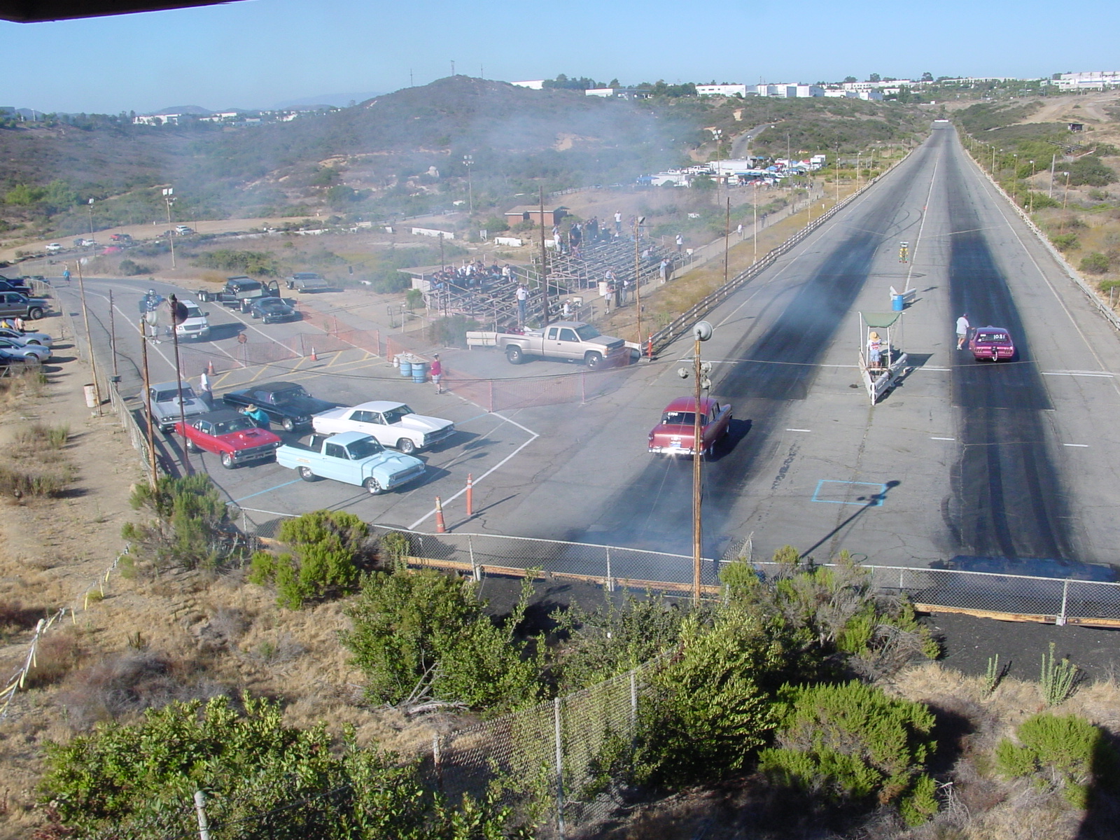 It's Saturday morning and I was waxing nostalgic for the line-up and the pit road and some Test & Tune action to pass the time on a day off. Bummer. No place to go anymore. And the car is still sitting up on stands in the garage. An expensive paperweight.... Anyhow, I have a bunch of Carlsbad pics I look through from time to time. I even sent you one before. Here's another (below) --the view downtrack from the bleachers next to the tower. It's funny, but the track never seemed that w-i-d-e when you were making a pass.