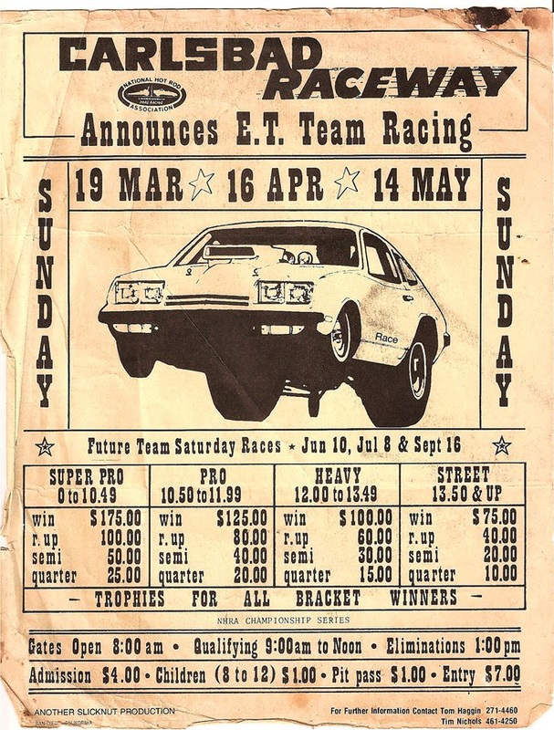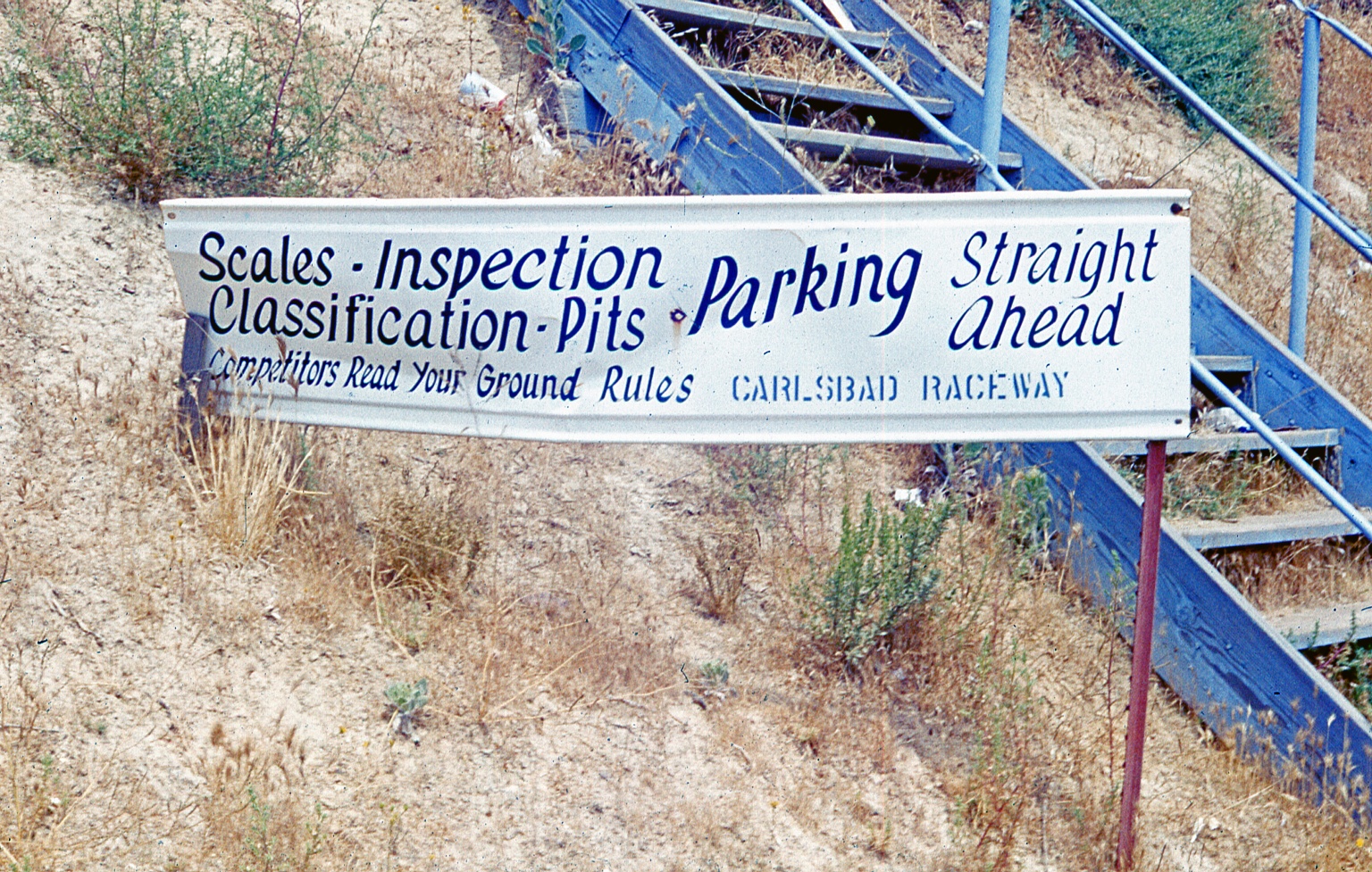 I sure do miss the Carlsbad Raceway. I lived south just over the hill and on the nights I couldn't go to the track, I could hear the cars running! Many of the people on my street were also racers and ran at Carlsbad at one time or the other. The weekends were spectacular as Palomar Airport Road was like a parade of race cars on trailers or being driven to the Raceway.