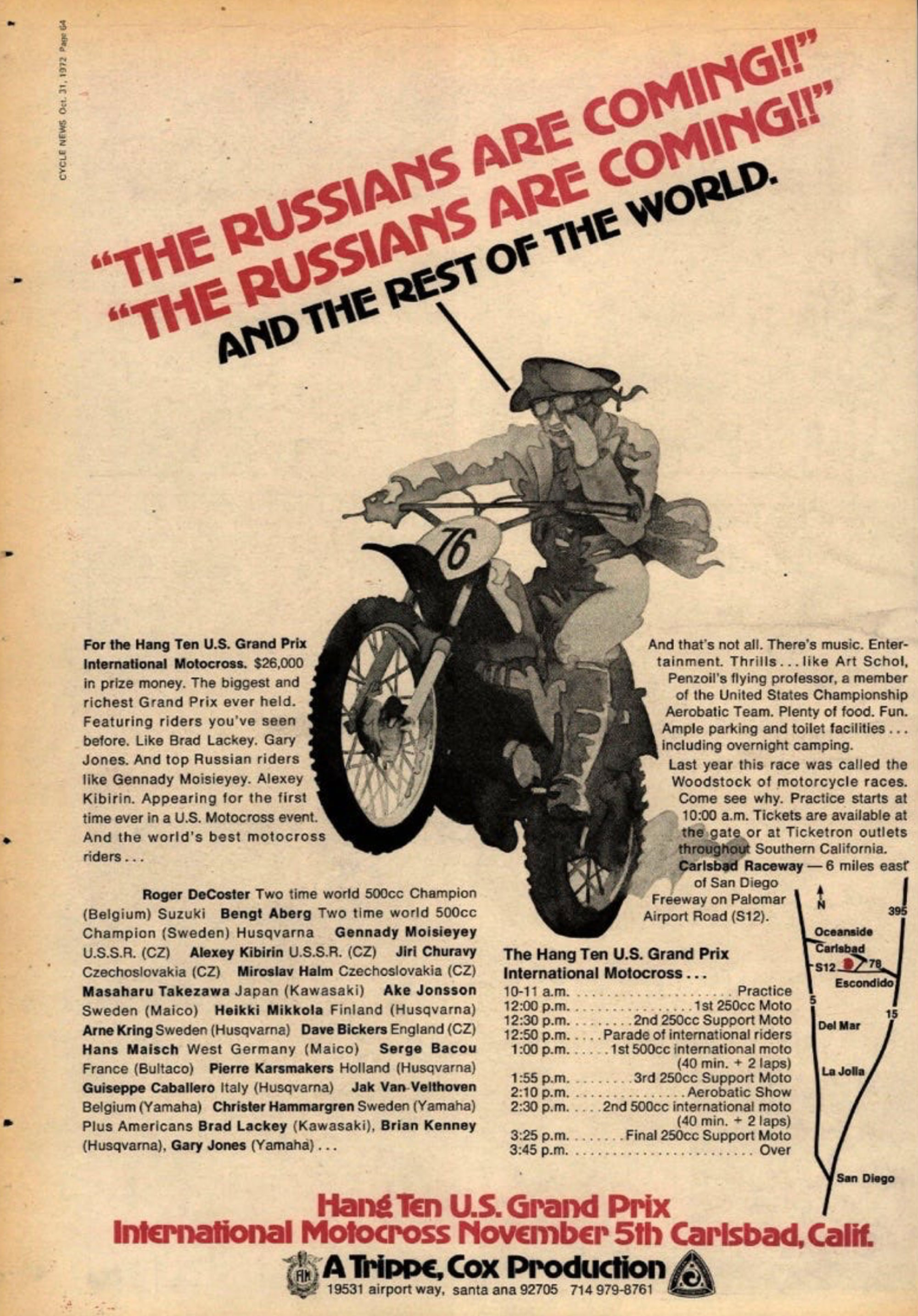 In 1972, Russia promised to send their top three riders to compete in the World Championship. The promise was so legitimate that President Nixon was scheduled to officiate. The Secret Service even vetted our house for President Nixon to use as an outpost! Russia didn’t keep that promise on Nov. 5th, 1972 - or ever. We can’t trust all Man’s promises.